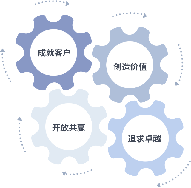 成就客户是一切决策的出发点,,创造价值是衡量所有工作的标准,,,,追求卓越是我们做事做人的态度,,开放共赢是我们的格局也是最终的结果。。。。价值观的齿轮环环相扣,,,推动着组织里的每个人不断向前。。。